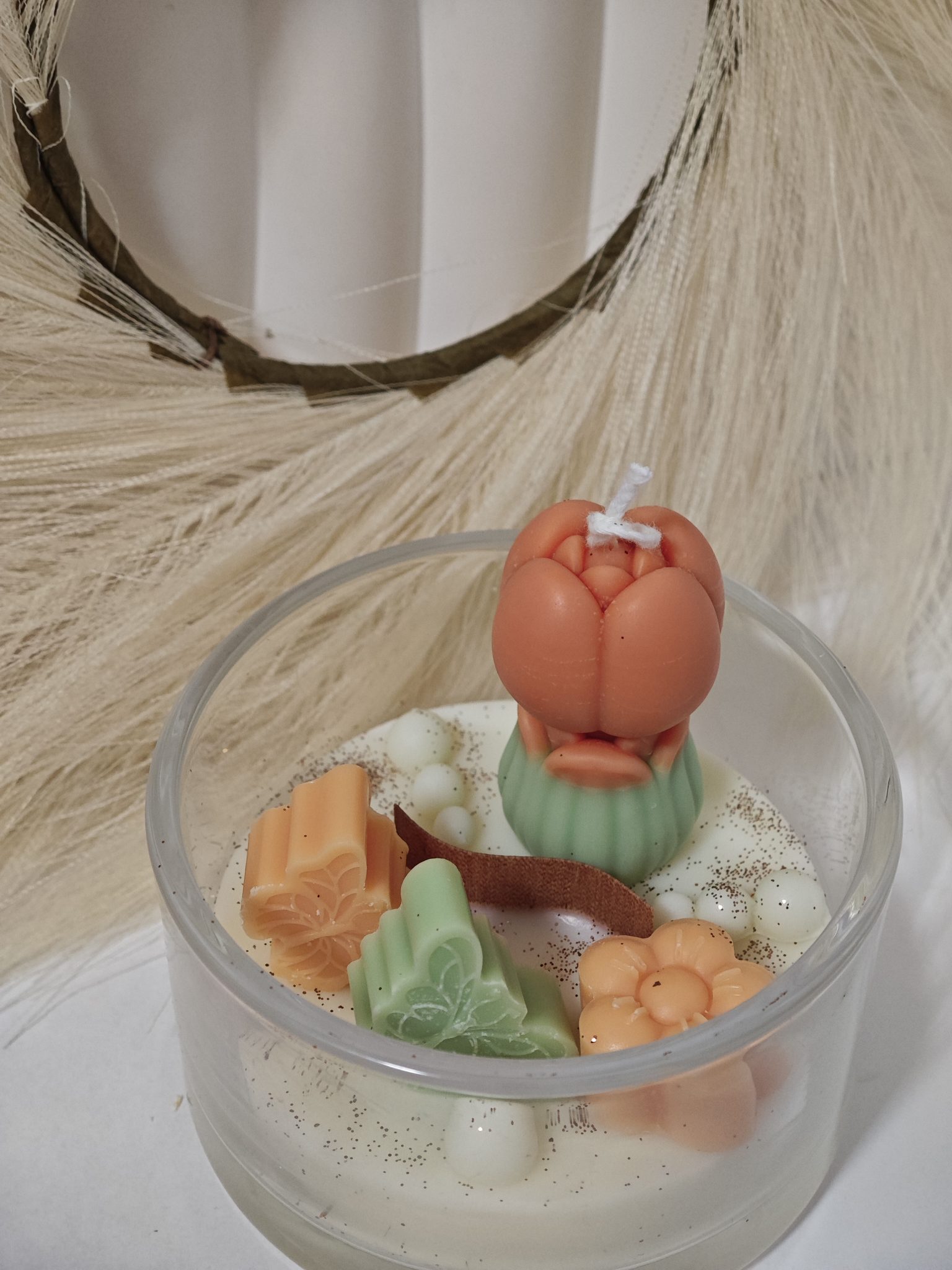 A gyertya központi eleme a kézzel formázott, aprólékosan kidolgozott szójaviasz tulipán, melyet a világhírű Miss Million parfüm elegáns, virágos-mézes jegyeivel tettünk felejthetetlenné.