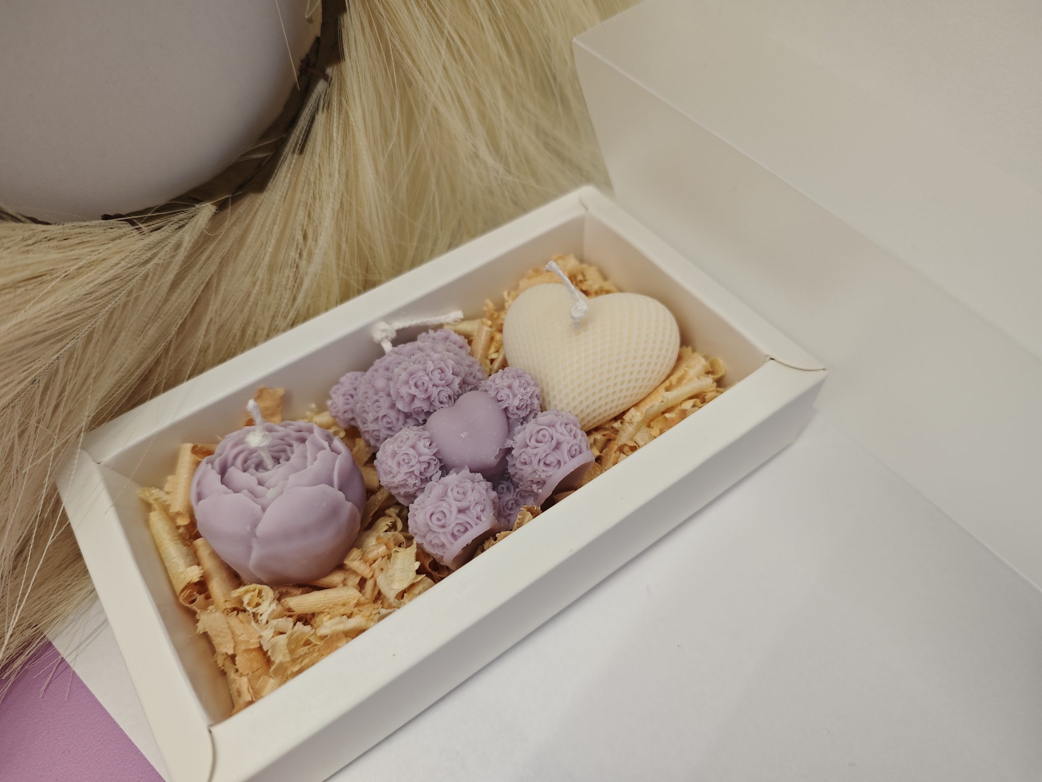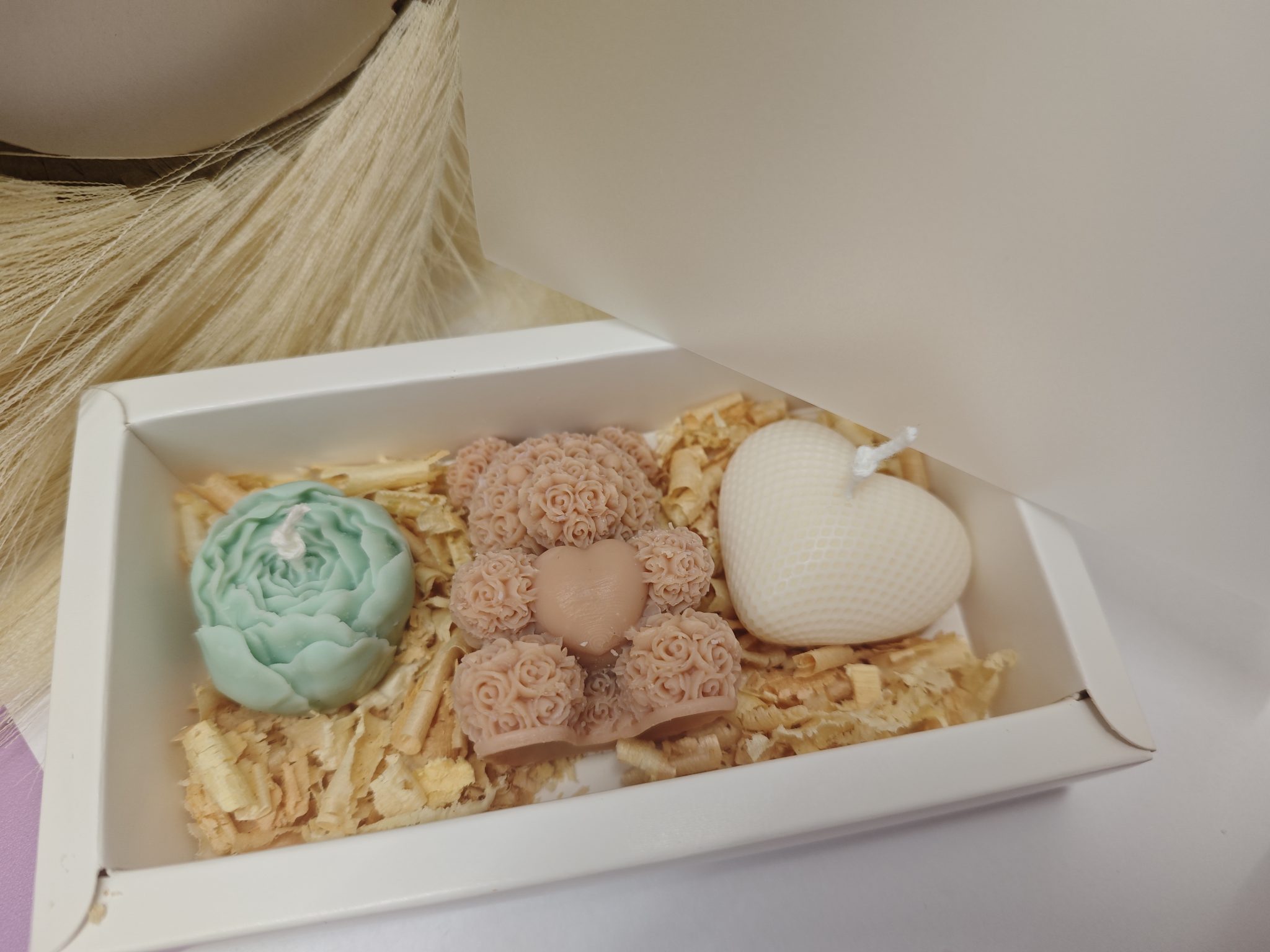 „Az Édes Ölelés boxunkkal a szeretet nyelvén beszélhetsz. A csomagban egy kézzel öntött krémszínű mackó, egy bájos rózsaszín rózsa és egy szenvedélyes vörös szív kapott helyet, melyek mindegyike 100% természetes szójaviaszból készült. A cirbolyafenyő forgács illatos ölelésében érkező szett tökéletes választás Valentin-napra, évfordulóra vagy csak úgy, szeretetből. Kézműves gondosság, vegán alapanyagok, azonnali ajándékozásra készen.”